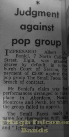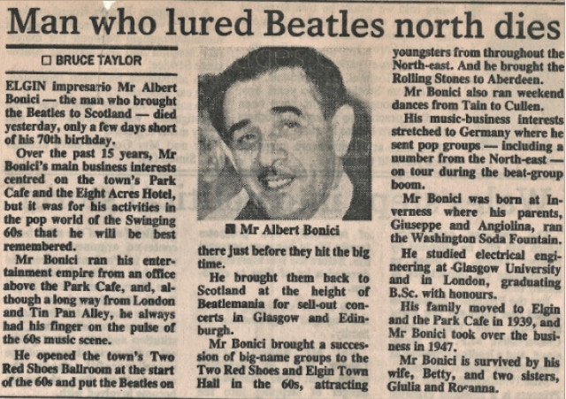 Albert in connection with Gordon Hardie booked the Beatles to play at the Two Red Shoes Ballroom in Elgin on 3 January 1963, and Aberdeen Beach Ballroom on the 6th January. Albert was very business focused, and on one occasion took the Small Faces to court over their failure to perform, as reported in the Peoples Journal.